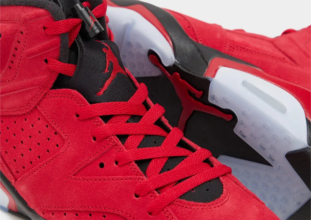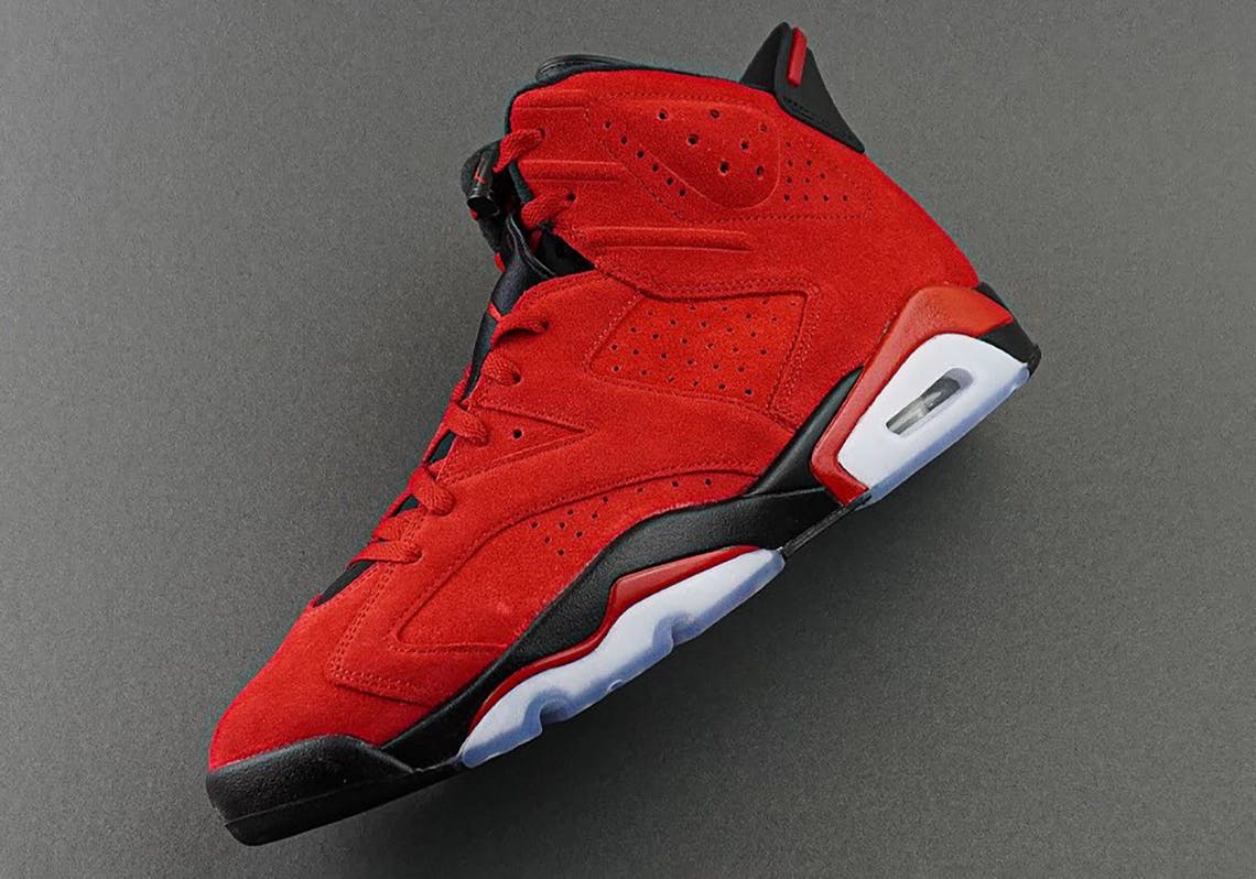 The all new Air Jordan 6 Retro "Toro" is here and is dressed in an all-red suede upper with a clear icy outsole!